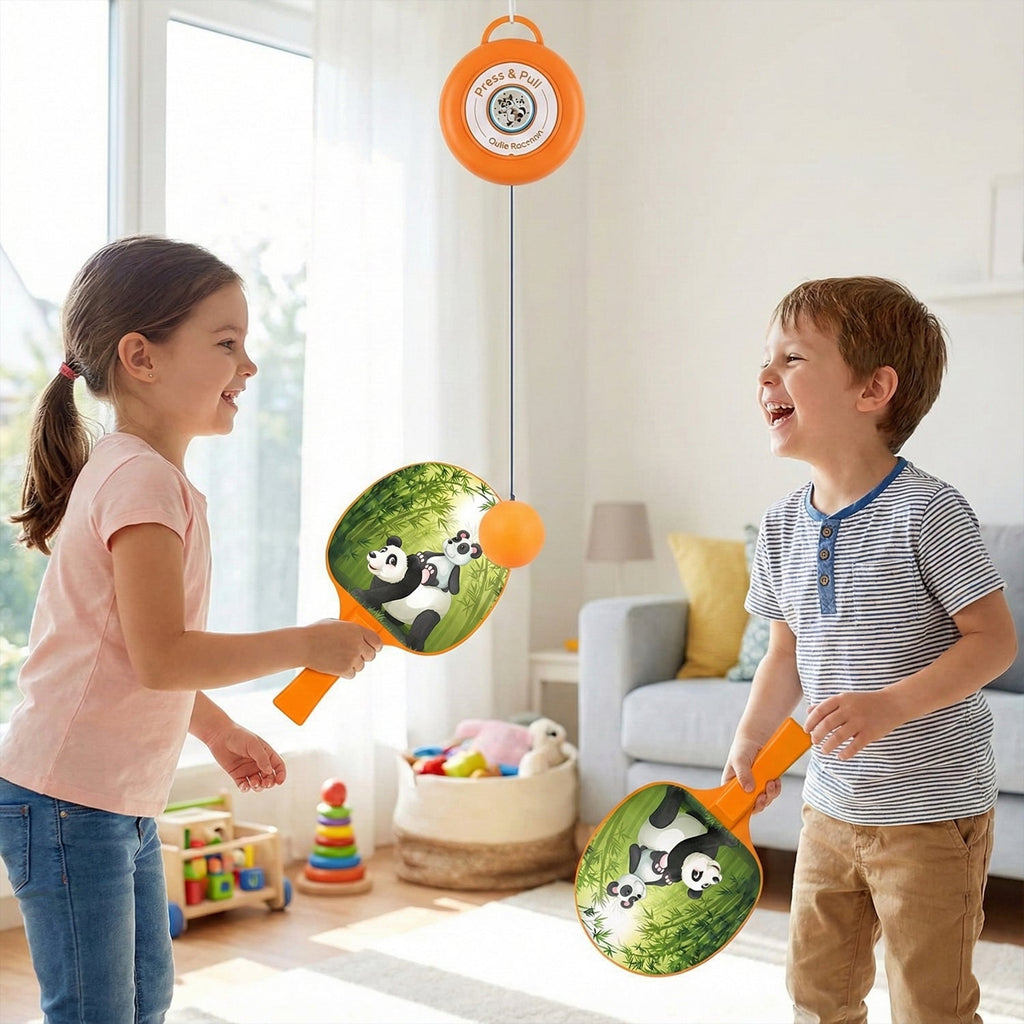 The Hanging Table Tennis Trainer Set is the perfect game to introduce kids and beginners to table tennis in a fun and engaging way. This set includes two paddles and three balls, designed with an adorable panda graphic that attracts kids. The set features a unique Press & Pull system, where the ball is attached to a retractable string, allowing for continuous hitting without the need for a full table setup. Whether for indoor play, learning coordination, or family fun, this table tennis trainer helps improve reflexes, focus, and hand-eye coordination.